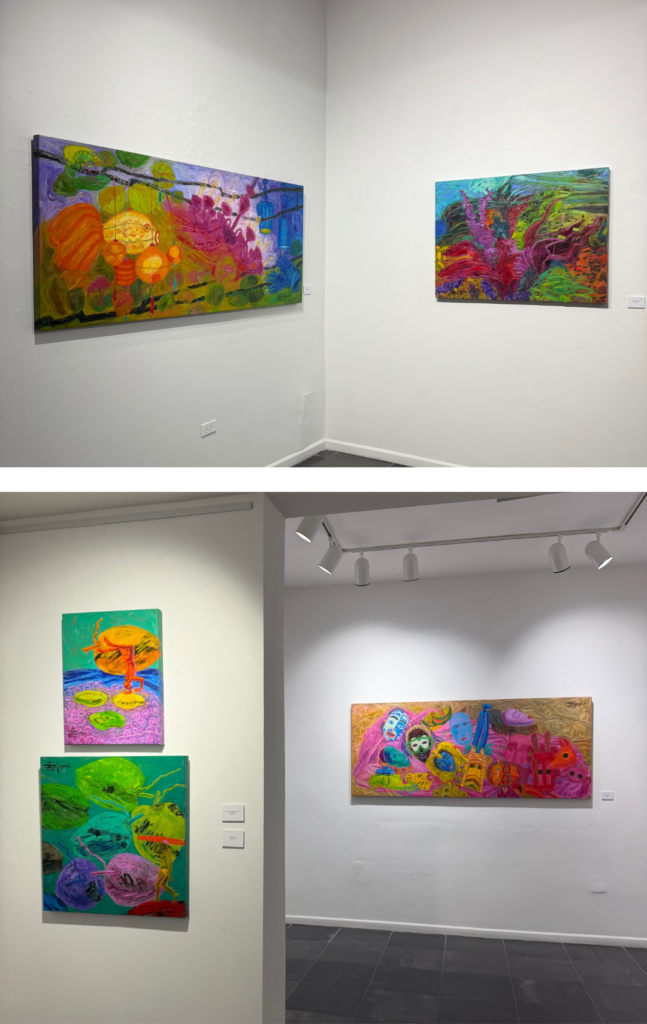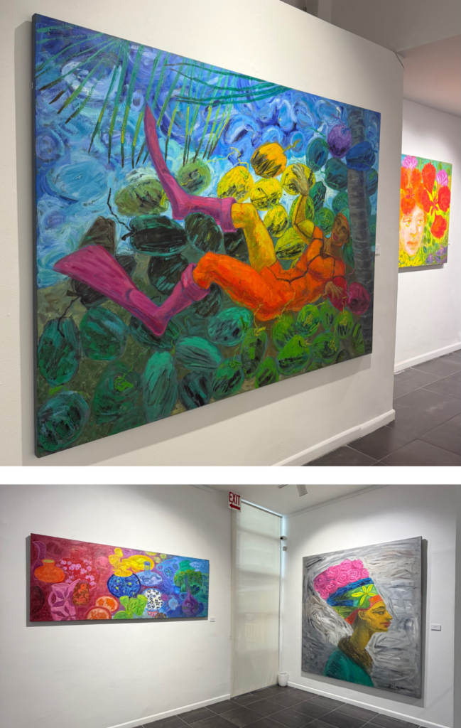 “Mi mitología es una mezcolanza, pero con un toque más tropical, sobre todo ahora que he vuelto a Puerto Rico. Cuando salgo a pasear mi perrita encuentro en el suelo flores, mangoes y cocos y me los llevo a casa. Empecé a pintar cocos de nuevo; son cocos accidentados, con sus manchas y rayazos, pero ahora de todos los colores; un poco más mágico. Por eso esta nueva exposición se llama ‘El mundo mágico de Cancio’”, explica.